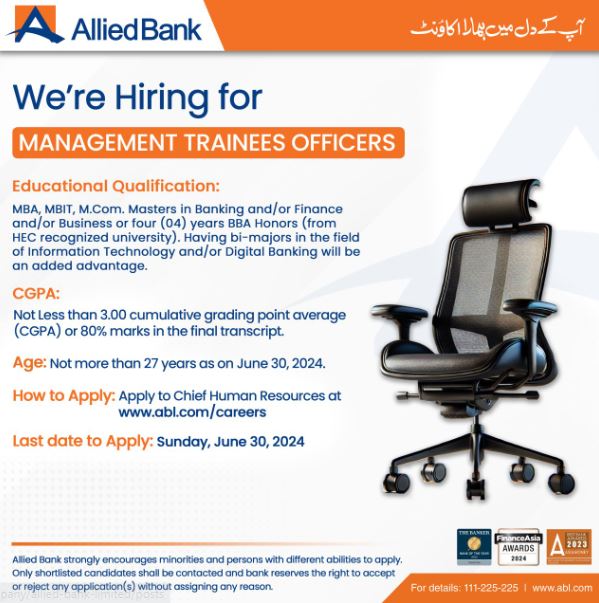 Are you willing to grow your career with Allied bank then good news is that ABL Bank announced Latest Vacancy. They announce Management Trainees Officers Jobs for Pakistani Males and Females who meet eligibility Criteria.